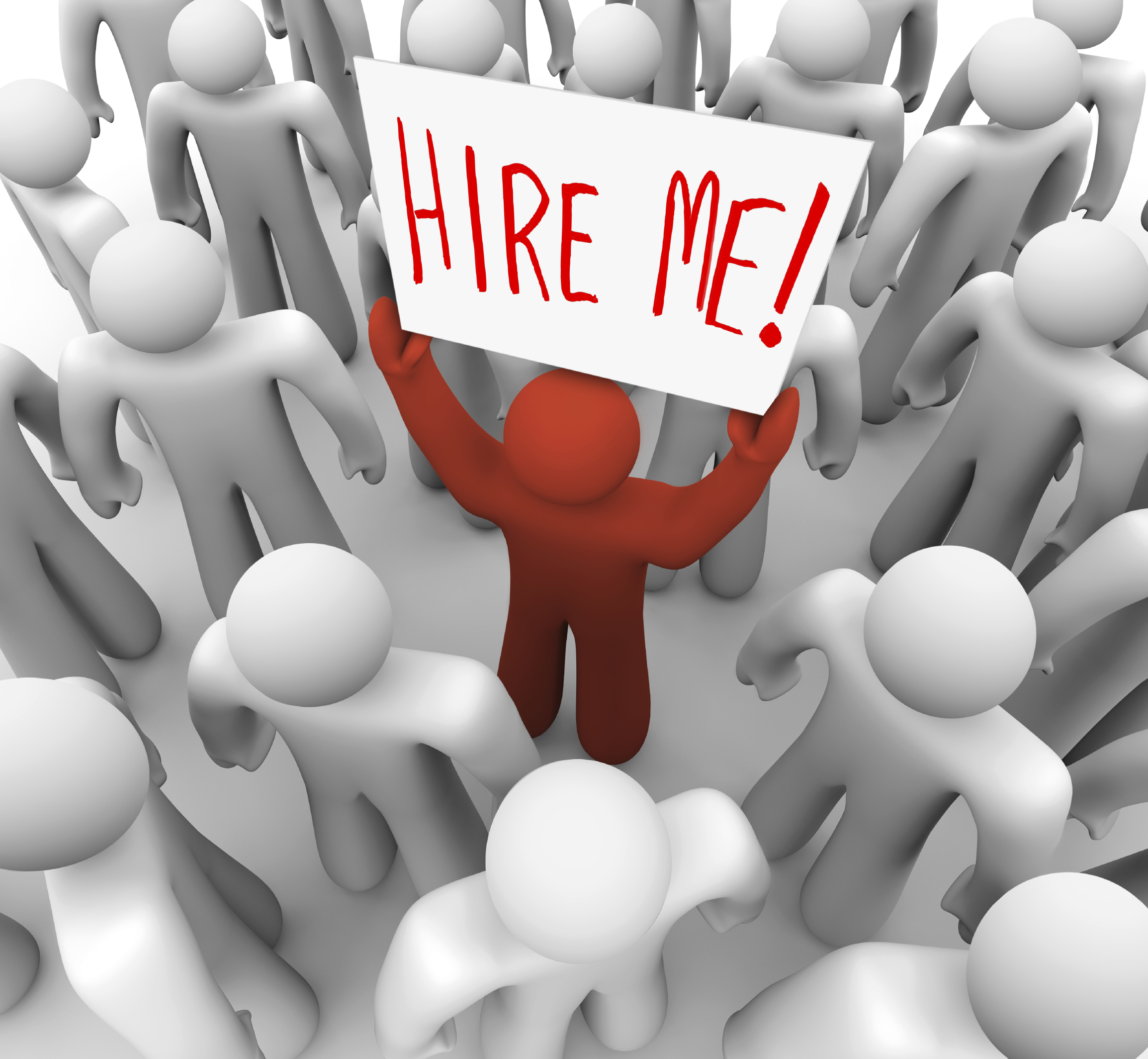 A red person stands out in a crowd holding a sign reading Hire Me